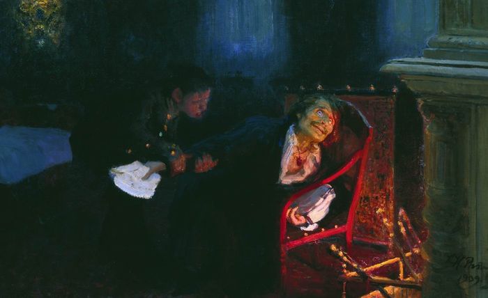 Upon a stump sat Basavriuk, quite blue like a corpse. He did not move so much as a finger. His eyes were immovably fixed on something visible to him alone: his mouth was half open and speechless. Nothing stirred around. Ugh! it was horrible!